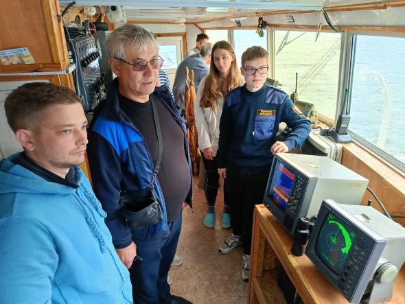 Далее нам капитан судна в формате «вопрос-ответ» рассказал «биографию» судна и поведал его технические характеристики. Всеобщий интерес вызвал самый большой штурвал на судах подобного типа, чудом сохранившийся в рубке НИС «Г. Ю. Верещагин». Был задан злободневный вопрос: подавалась ли когда-либо команда «Человек за бортом» - три продолжительных звонка громкого боя. Оказалось, что такого ЧП не было! В этом несомненная заслуга нашего строгого капитана.
